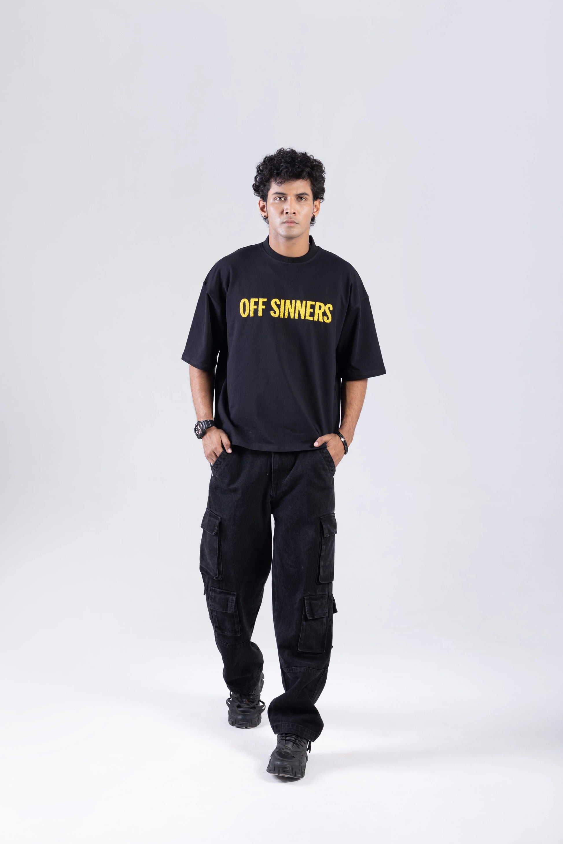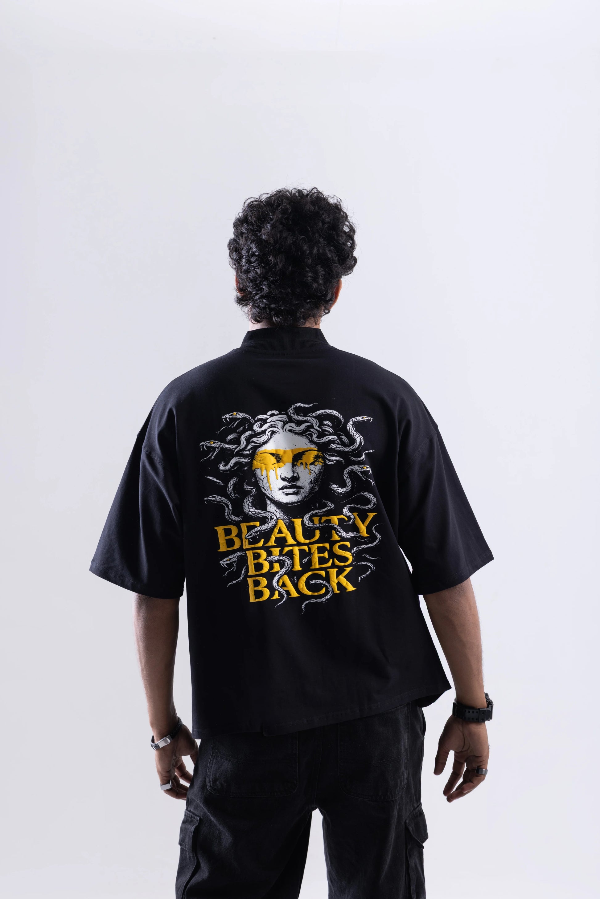 “Beauty Bites Back” is a unisex anthem for anyone who’s ever been misunderstood for standing out — whether it’s your style, your silence, or your strength. The front keeps it sharp and minimal with a cracked gold “OFF SINNERS” logo — fractured like society’s view of perfection, but still intact and defiant. The back print is a scream in art form. It’s a tribute to everyone who turns judgment into power.