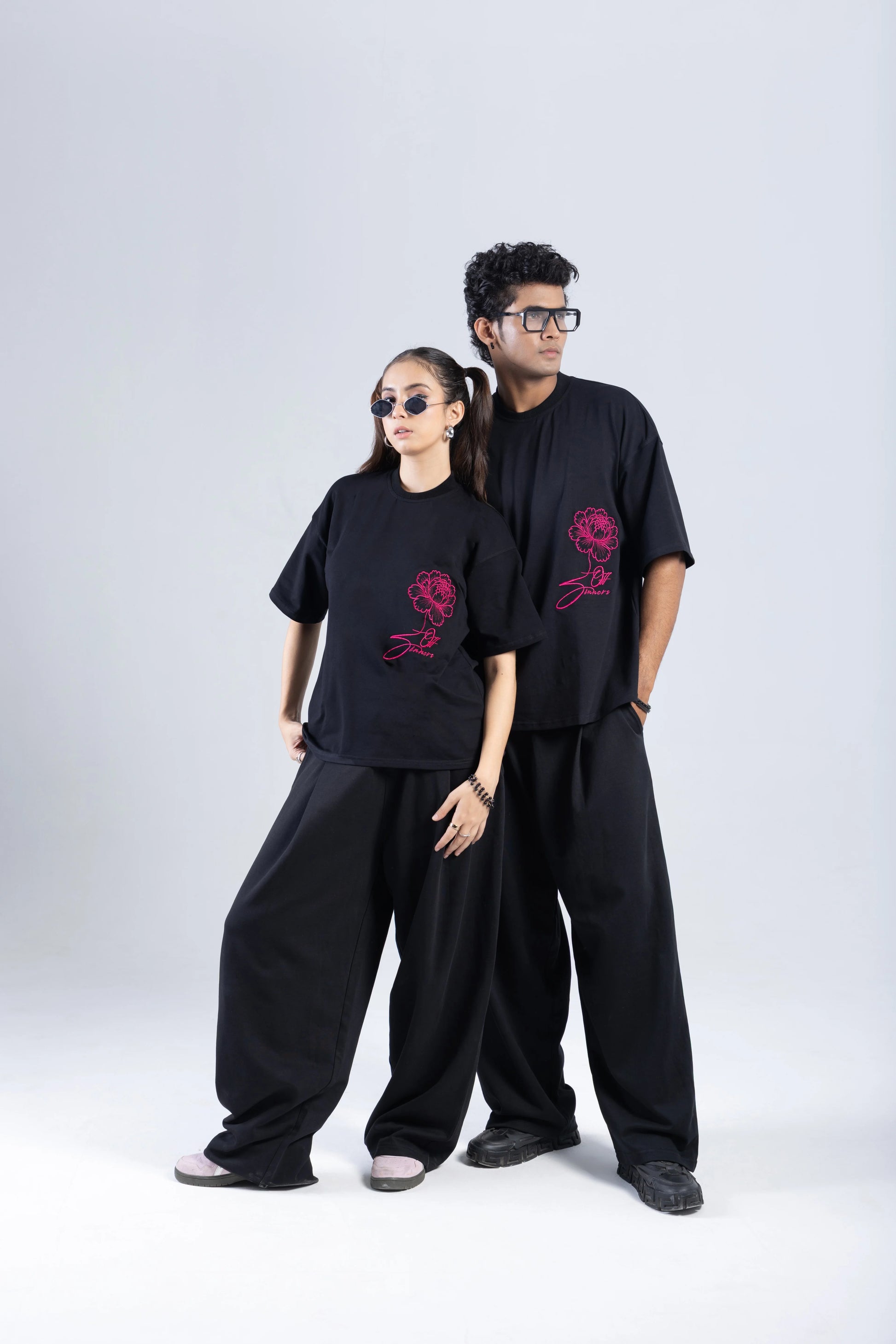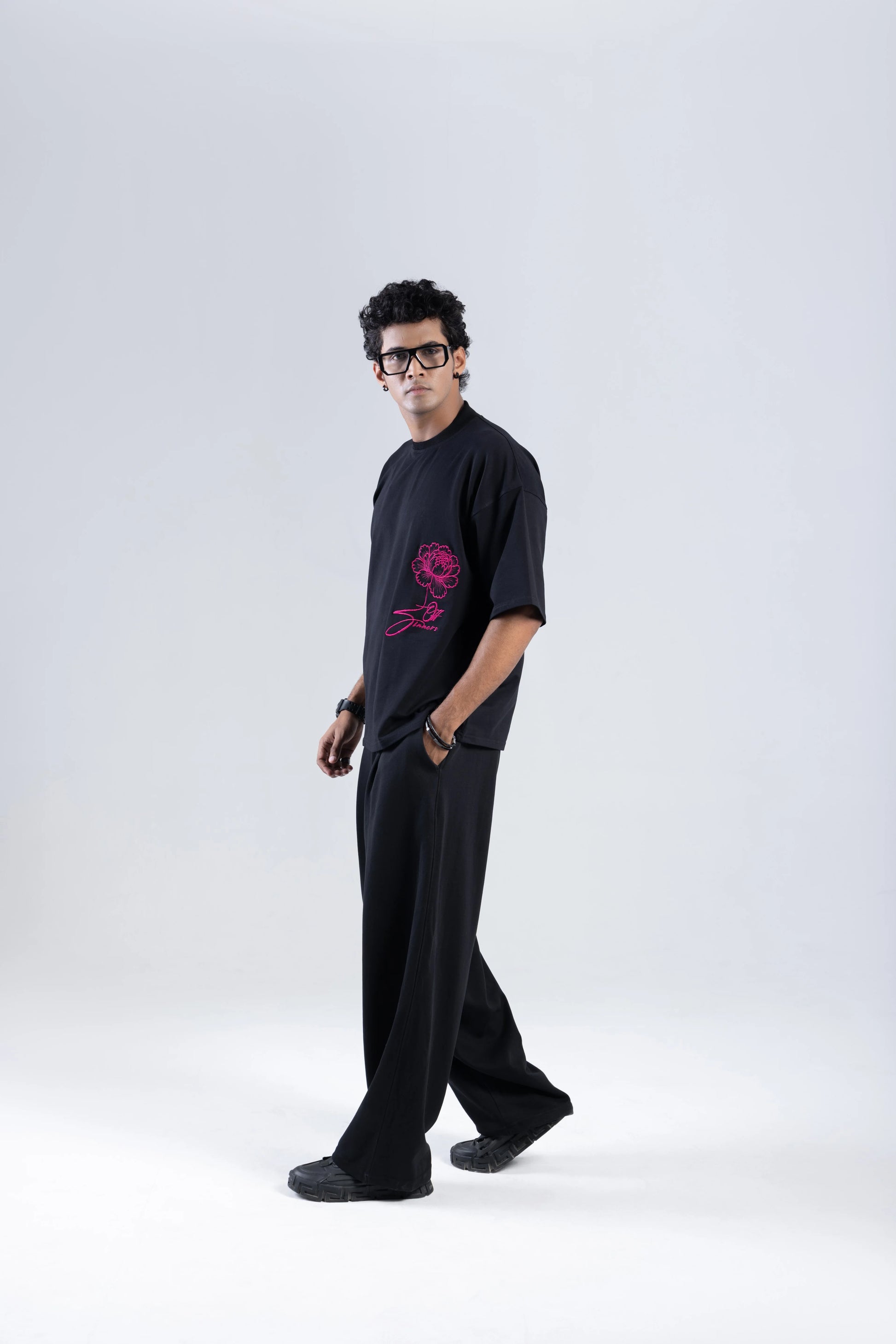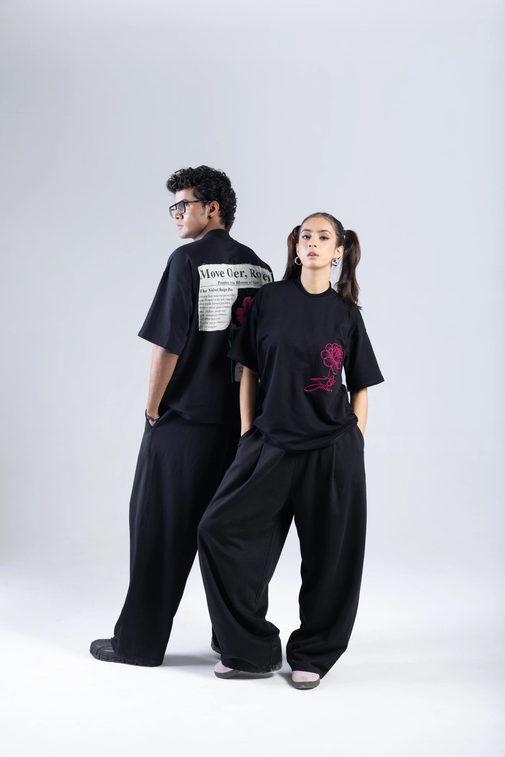 The front flaunts a sharp magenta sketch of a blooming peony with Off Sinners’ script coiled into its stem — subtle yet subversive. The back tells the full story: a manifesto layered over a hyper-realistic peony using a luxe blend of puff print and patchwork — merging texture with meaning to elevate this into a wearable art piece.